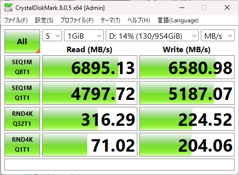 CristalDiskMark によると、Read 6500MB/S以上、Write 3900MB/s以上で充分に高速なディスクを搭載しています。