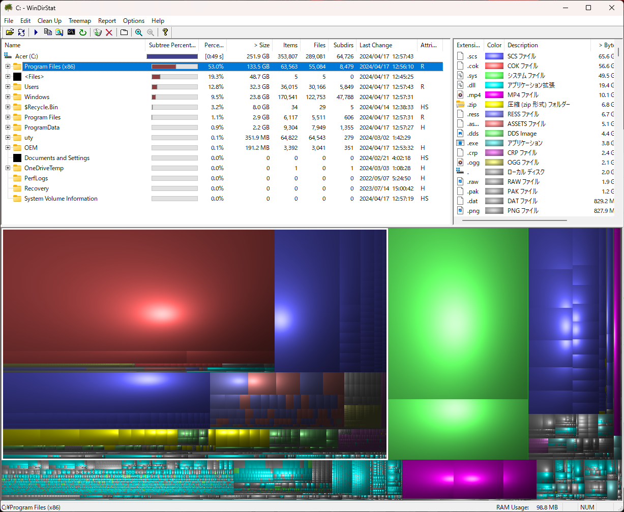 「SSD増設後の使用量」で、同様に白枠で囲われた部分が、同じく「Program Files(x86)」フォルダーとなります。「steamライブラリ」を移動するとこんなにも使用量が削減をされます。