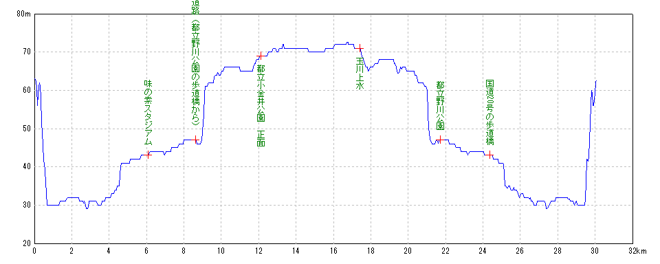標高69mと多摩川の30mと比べると、約40mを上ってきたことになります。ただ、9kmをかけて登ってきているのでそれほど坂を上ったという気はしません。