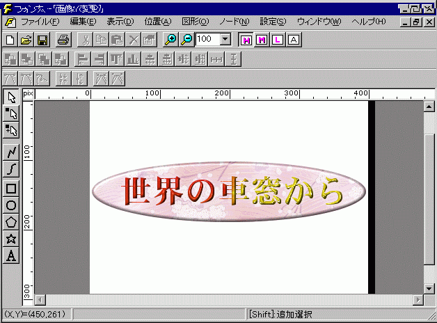先ほどの画面例で示した「世界に車窓」のLOGOに対しては、楕円にWindowsフォルダーの「花見.bmp」を貼り付けて、エンボス効果を加えました。
